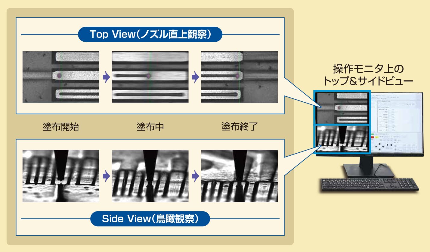• トップビュー(ノズル直上)とサイドビュー(鳥瞰)を同時観察