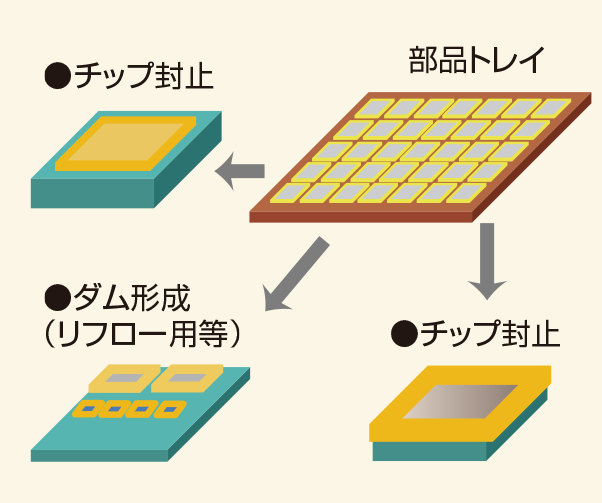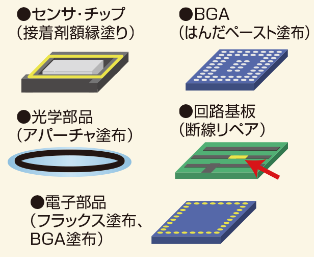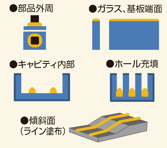 - 樹脂材料:UV硬化剤、エポキシ、シリコーン、ポリイミド、レジスト等