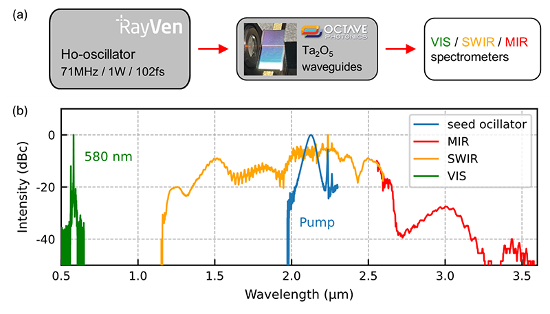 光周波数コムには、オクターブにわたる広帯域スペクトルを用いたキャリア・エンベロープ・オフセット周波数(fCEO)の精密な安定化が求められます。従来のスペクトル拡張手法では、異常分散の影響により、Tm/Ho系レーザーへの適用が困難とされています。これに対し、集積型導波路は、低パルスエネルギーでの動作と分散特性の設計自由度により、有効な解決策となります。