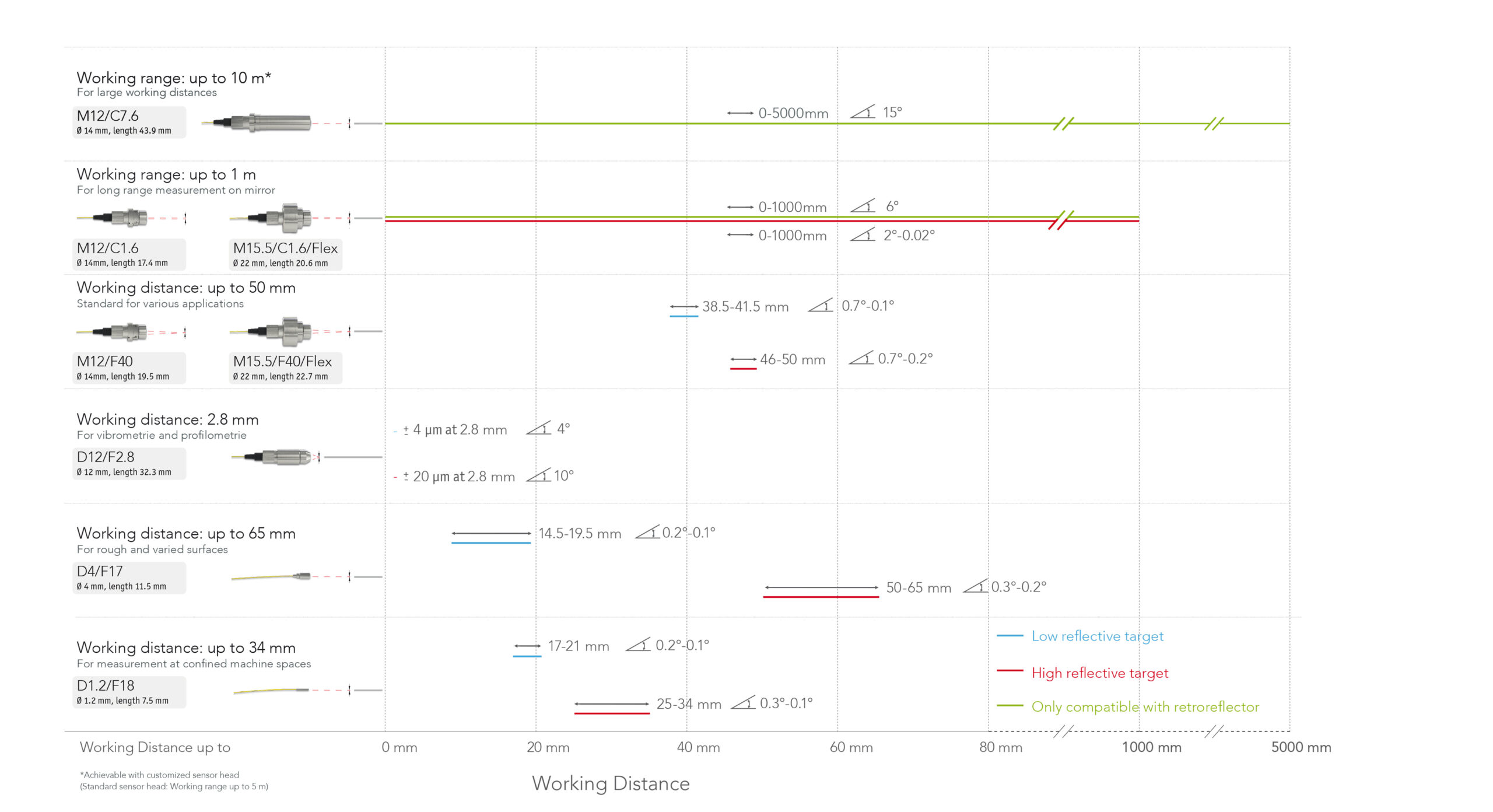 attocube社 IDS レーザ干渉式変位センサには、狭い場所向けの超コンパクトヘッド、位置合わせが簡単なタイプや様々なターゲット材料(ガラス、アルミニウム、セラミックなど)に適したタイプなど、用途に合わせてさまざまなセンサヘッドからお選びいただけます。(※下図はクリックで大きく拡大表示します)